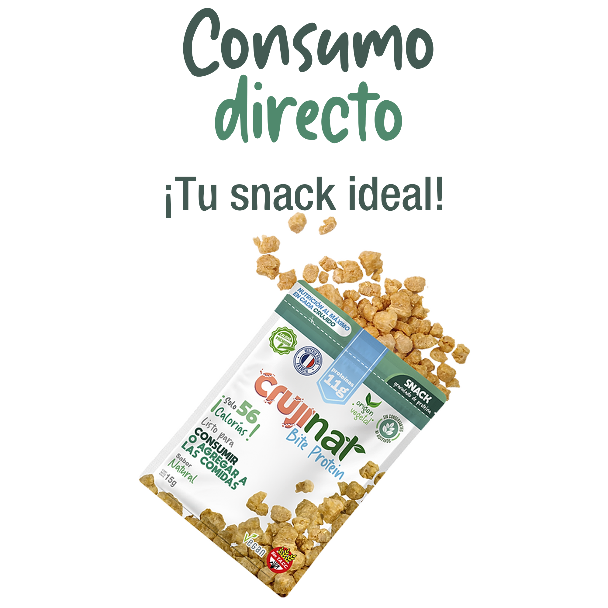 Además de consumirlo como snack, podes agregar Crujinat® a las comidas y enriquecerlas nutricionalmente (Ensaladas, sopas, yogur leche y en todo lo que se te ocurra). Crujinat® puede ser utilizado para cocinar, y ser incorporado en la cocción, incluso en recetas de reemplazo cárnico como fuente principal, para ello tendrás que hidratarlas y luego moler los gránulos de proteína generando la base de tu receta.